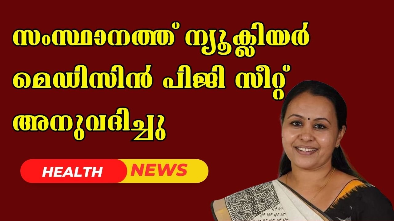 Health Minister Veena George announced that, for the first time in the state, PG seats in Nuclear Medicine have been approved. The seats have been allocated to Kozhikode Medical College. The minister clarified that this is the first time in the country that PG studies in Nuclear Medicine are possible in a state medical college. PG seats have also been sanctioned in Radiation Oncology at the Malabar Cancer Center. These PG seats, including those in Nuclear Medicine and Radiation Oncology, will further strengthen Kerala’s cancer treatment sector.